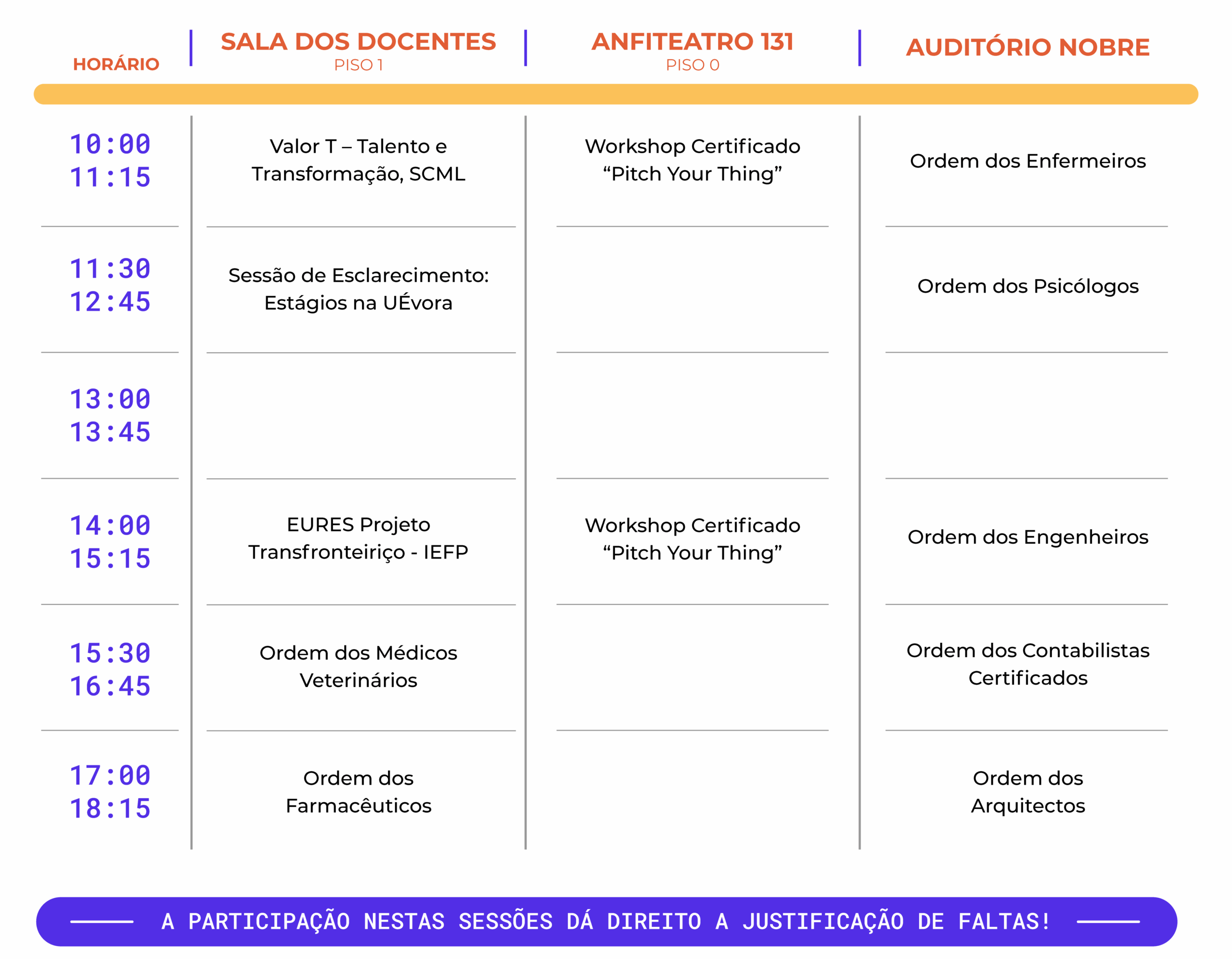 A Feira do Emprego irá receber as Ordens Profissionais dos Arquitetos, dos Contabilistas Certificados, dos Enfermeiros, dos Engenheiros, dos Farmacêuticos, dos Médicos Veterinários e dos Psicólogos. Numa sessão de apresentação onde os estudantes terão a oportunidade de saber mais acerca da Ordem. Critérios para aceder, importância das ordens profissionais, o seu papel na regulamentação da atividade, serão alguns dos tópicos apresentados. Os estudantes poderão ainda esclarecer as suas dúvidas.